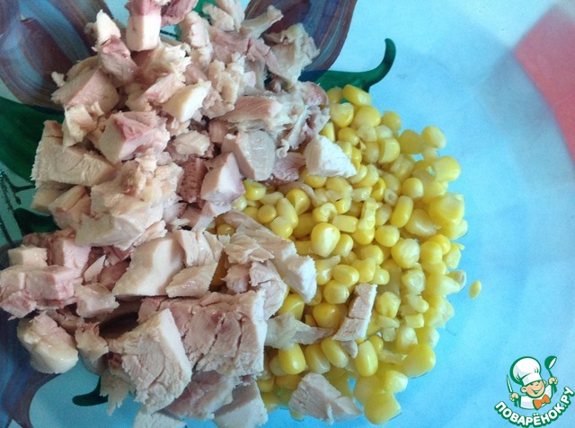 С кукурузы слить лишнюю жидкость. Мелким кубиком порезать куриную грудку