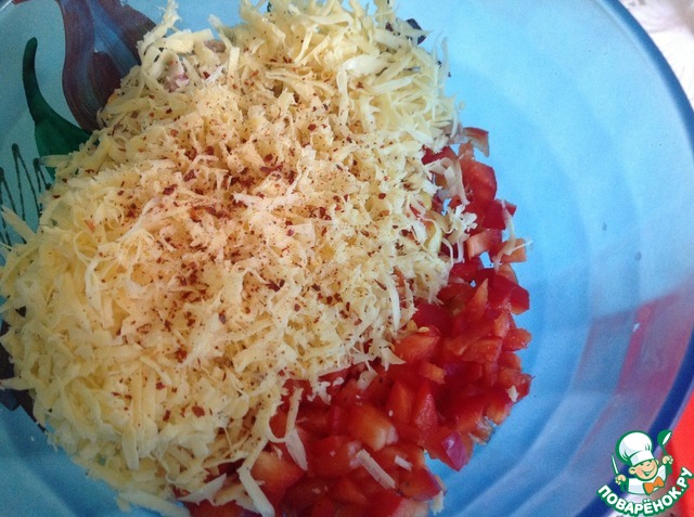 Болгарский перец нарезать маленьким кубиком. Сыр натереть на средней терке. Добавить молотый острый перец, если надо то соль