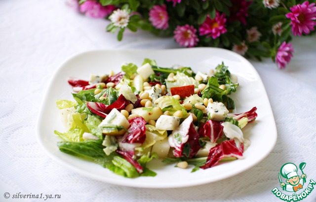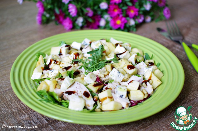 Можно сделать салат чуть иначе: выложить на блюдо слой салатной смеси, затем добавить кусочки курицы, сверху положить нарезанную грушу или яблоко, сыр (здесь бри и дор блю), сбрызнуть салат кремом-бальзамик.