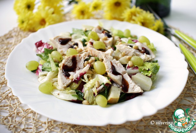 И вот такой вариант: салатная смесь, сыр, груша, курица, виноград, крем-бальзамик.