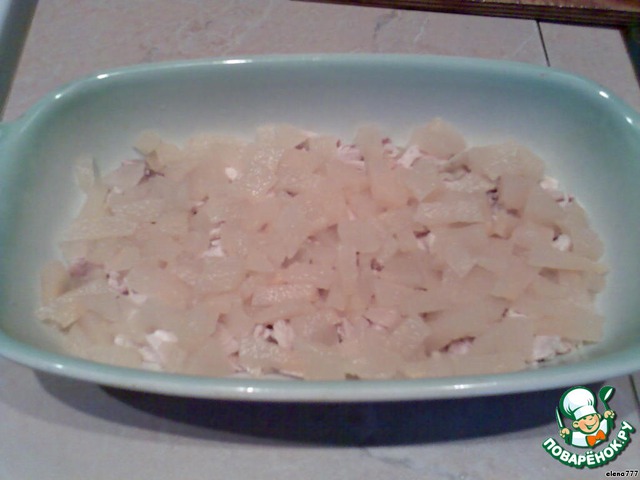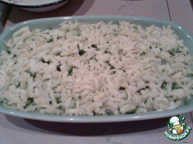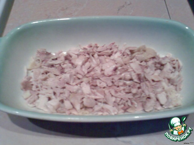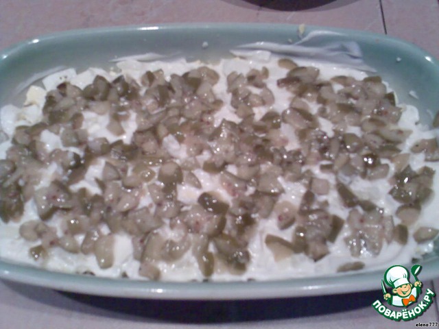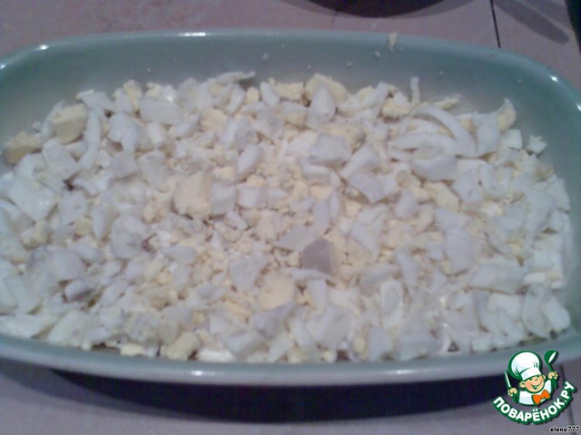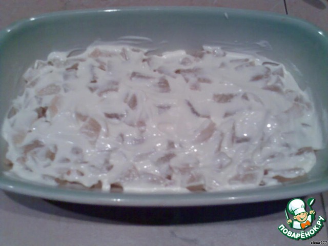 Затем - мелко-порезанную луковицу, рубленные яйца, промазать майонезом.