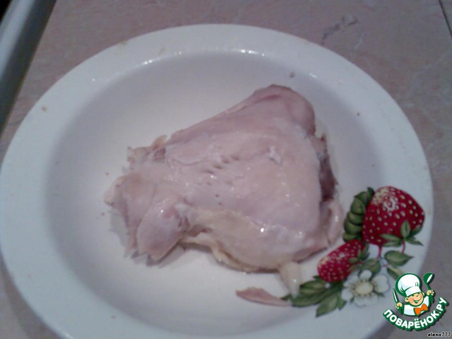 Окорочок отварить в подсоленной воде с лавровым листочком.