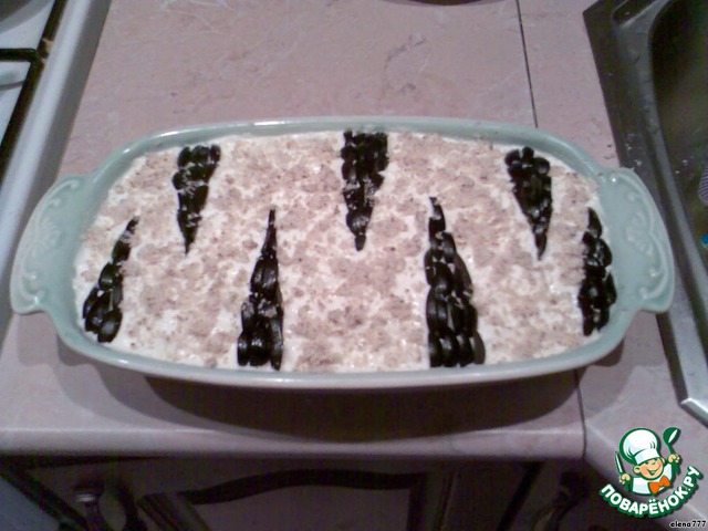 Посыпать тёртыми грецкими орехами и украсить порезанными маслинами ввиде полосочек у шкуры тигра. Приятного аппетита!!!