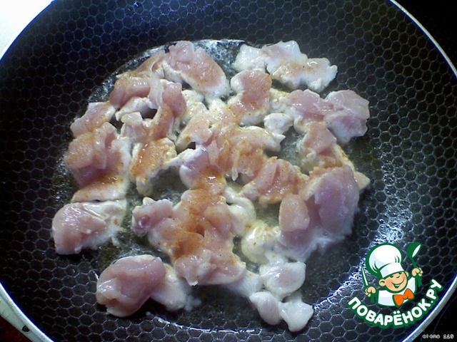 Курицу порезать на тоненькие маленькие ломтики и обжарить на растительном масле, с добавлением карри до готовности, остудить.