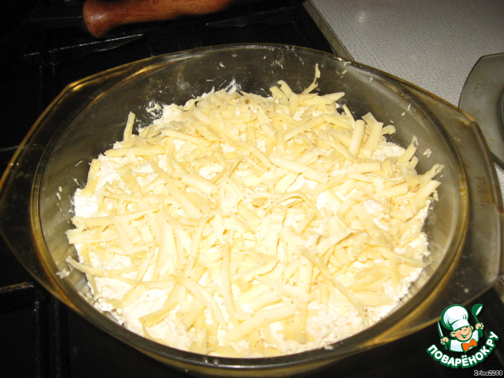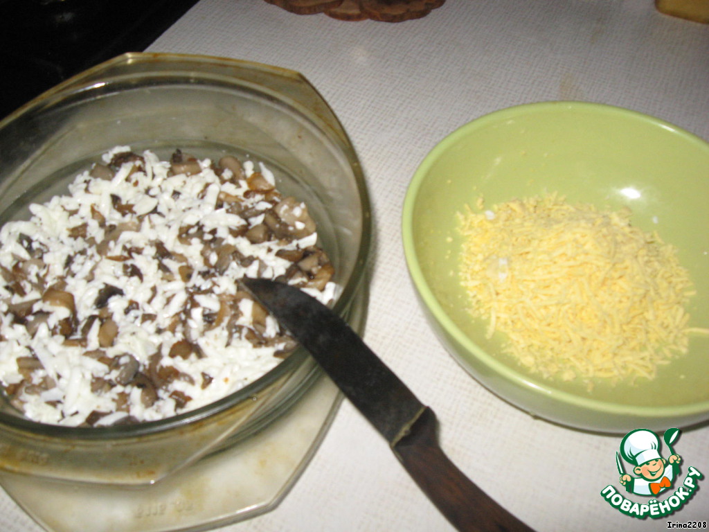Филе с желтками выложить на грибной слой и посыпать сверху тертым на крупной терке сыром.
