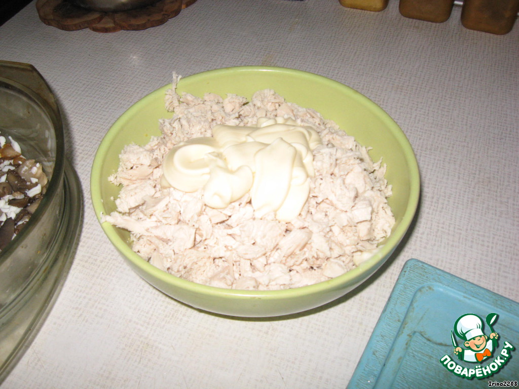 Грибы с белками выложить первым слоем в салатницу