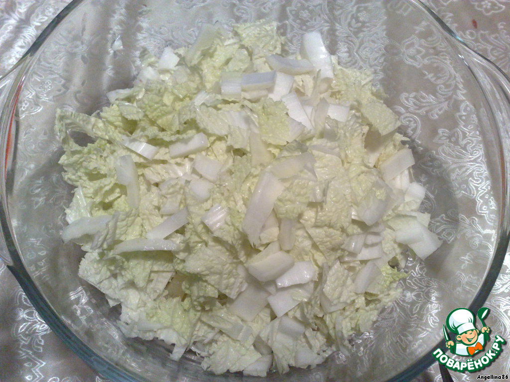 К ананасам добавить нарезанную пекинскую капусту (можно порвать руками на кусочки).