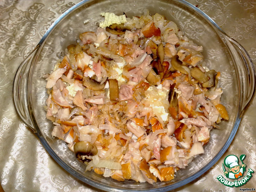 Грибы нарезать пластинками, обжарить на сливочном масле вместе с нарезанным полукольцами луком.