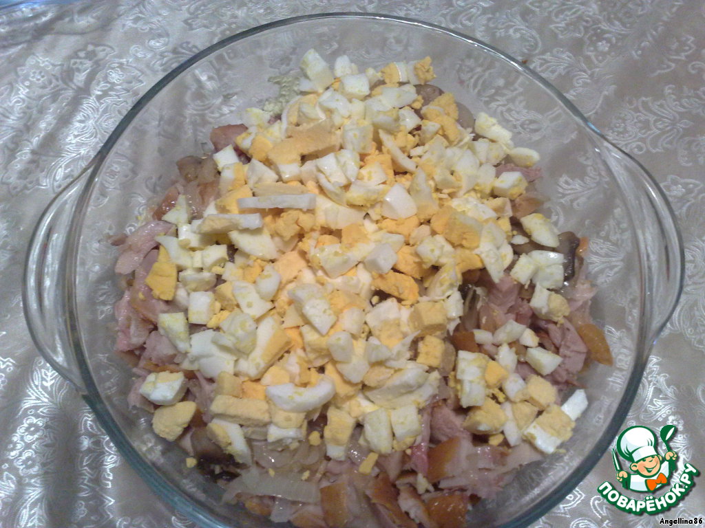 Копченые окорочка отделить от кости, нарезать кубиком, добавить к салату. Туда же добавить обжаренные с луком грибы.