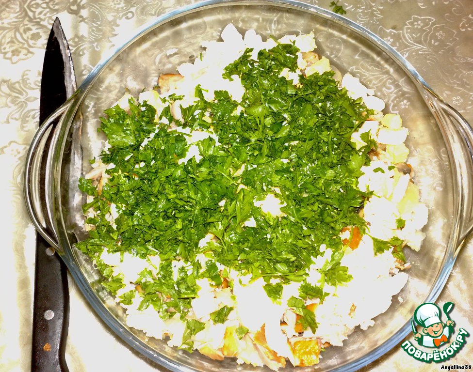 Зелень порезать и добавить к салату.