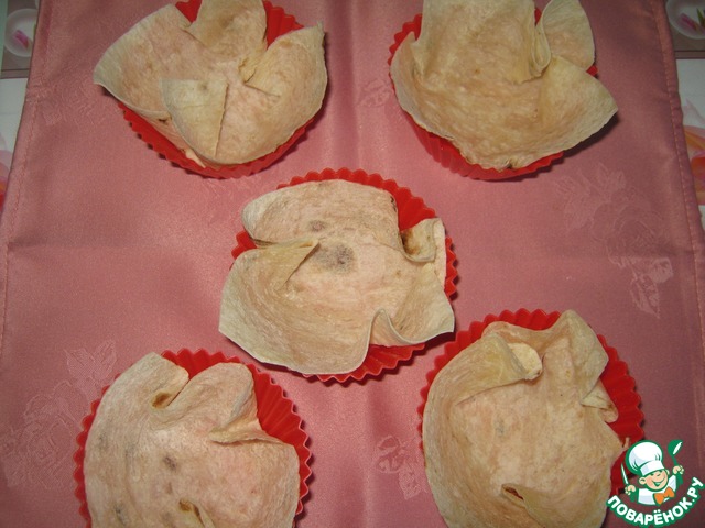 Берём тонкий лаваш, вырезаем квадраты 10 х 10 см, кладём в формочки для маффинов, ставим в духовку на 5-7 минут при t=120-130 *C.
