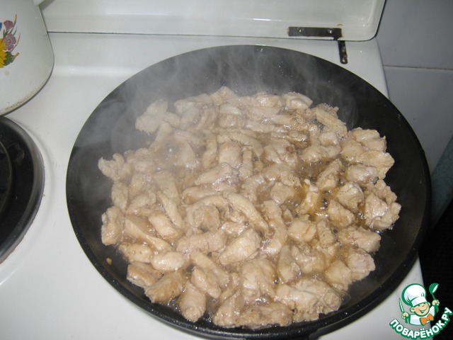 Куриное филе нарезать мелкими кусочками