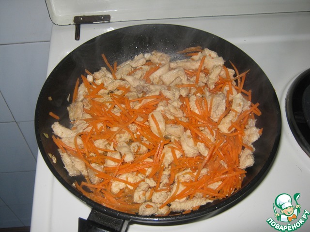 Добавить к мясу порезанную соломкой морковь и поджарить постоянно помешивая ещё 2 минуты. Выложить на тарелку и охладить.