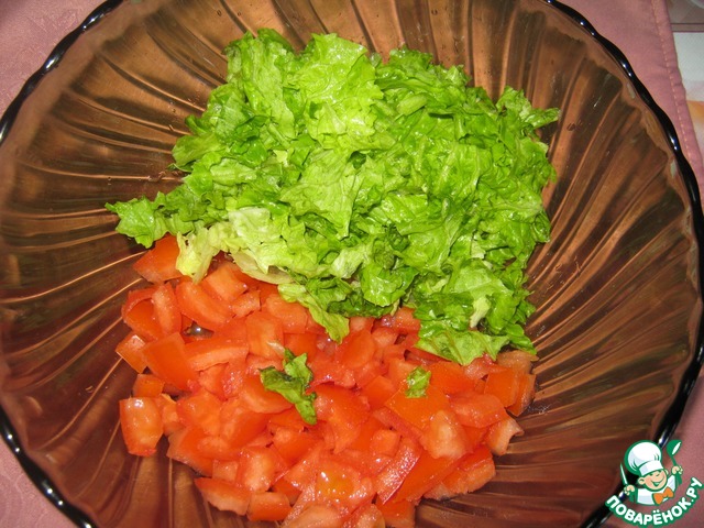 Помидоры порезать кубиком, удалив семена. Листья салата порвать руками.