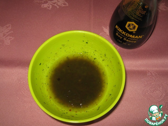 Приготовить маринад. Соевый соус, сок половины апельсина, чеснок, перец перемешать.