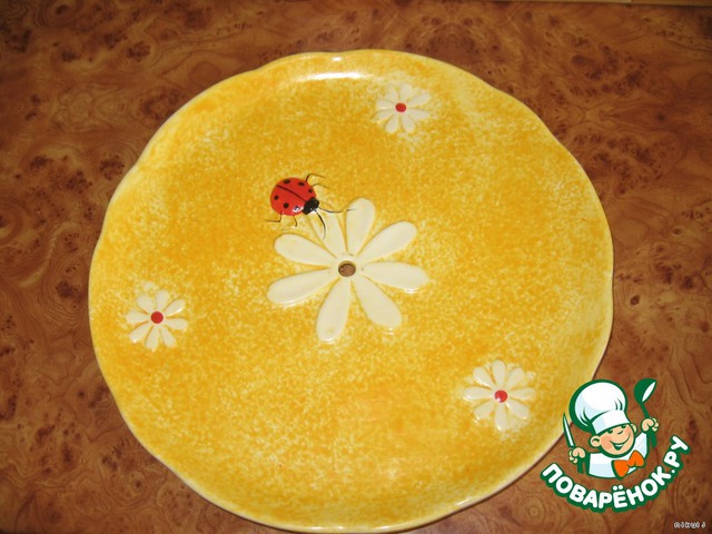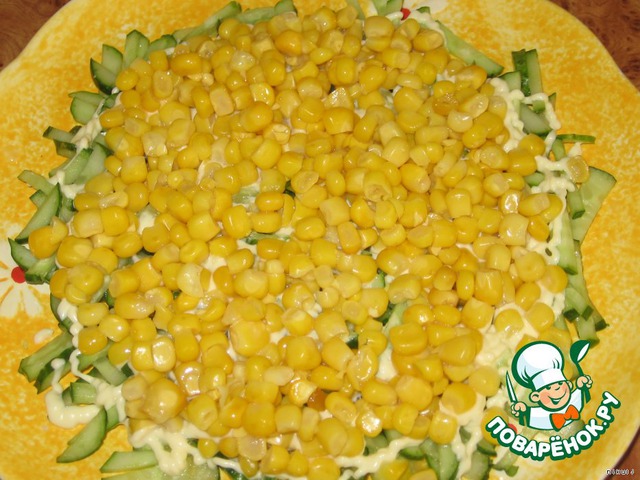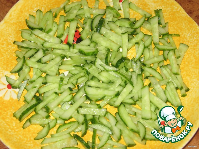 и размещаем на ней травку, по которой будет гулять наша курочка (порезанный соломкой огурчик). Чтобы все хорошо держалось нужно полить волшебным клеем - майонез.