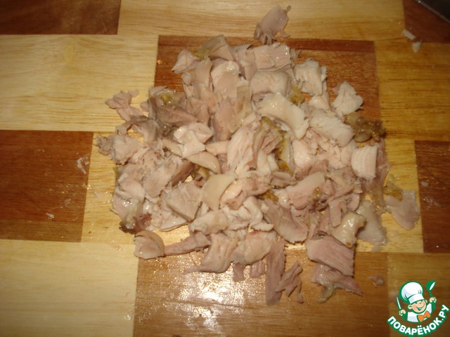 Запечённый окорочок очистить от кожицы и нарезать кубиками.