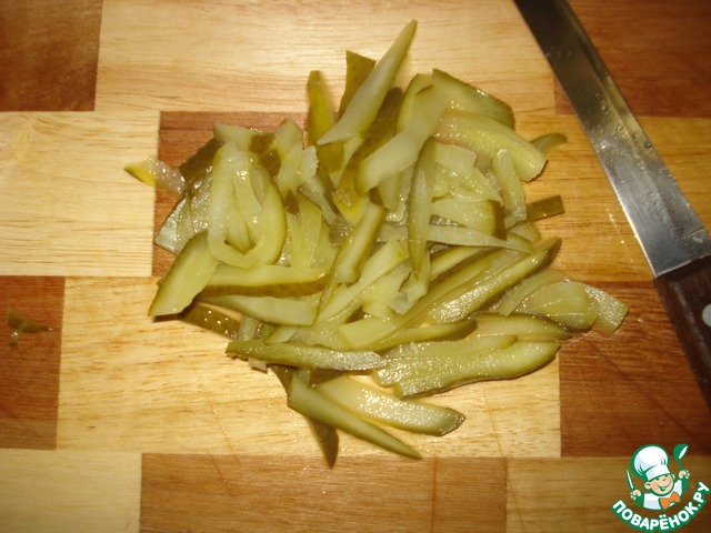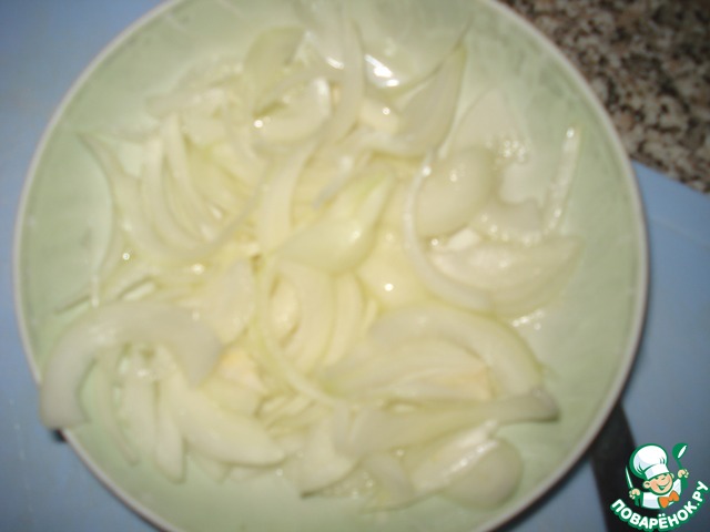 Половину лука нарезать полукольцами и залить соком 1/2 лимона дать постоять 10-15 минут.