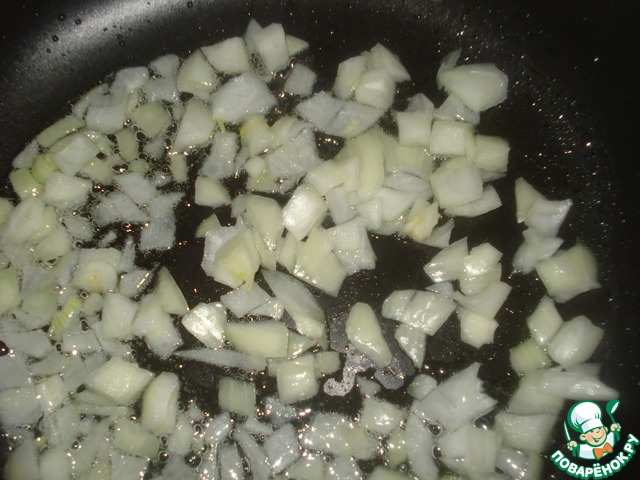 Вторую половину лука нарезать кубиками и обжарить в небольшом количестве масла.