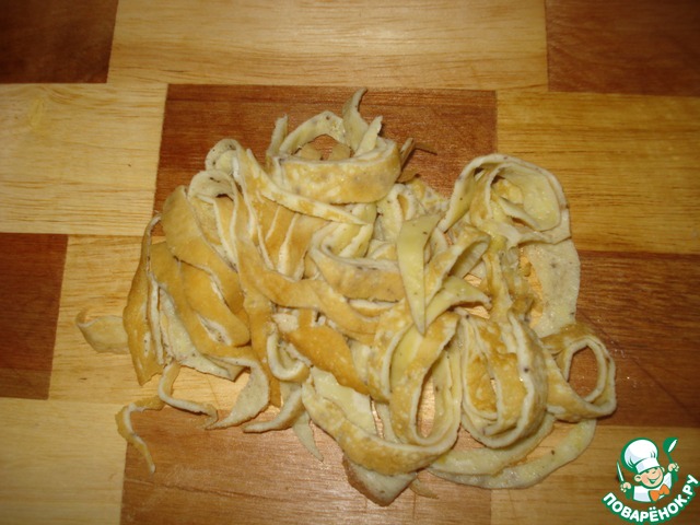 Яйца смешать с 2 ч. л. крахмала, в эту смесь добавить молотый черный перец и пожарить блинчики. После того как блинчики остынут, нарезать их в виде лапши.