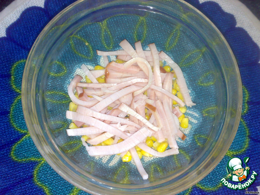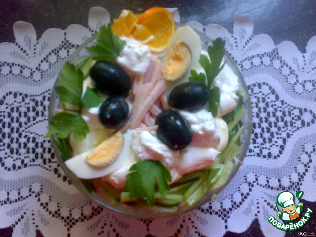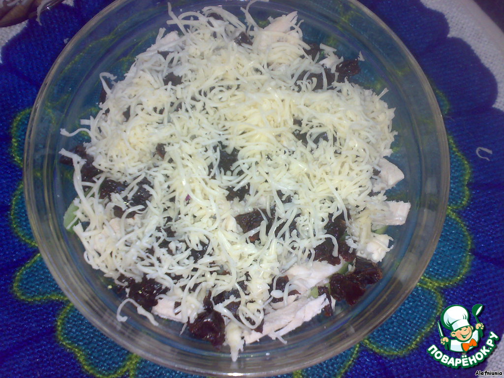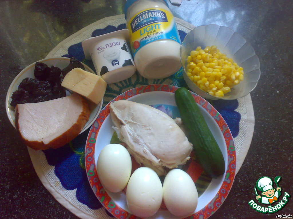 В стеклянный салатник выкладывать слоями кукурузку, ветчину, яйца, огурец, филе, чернослив, сыр.