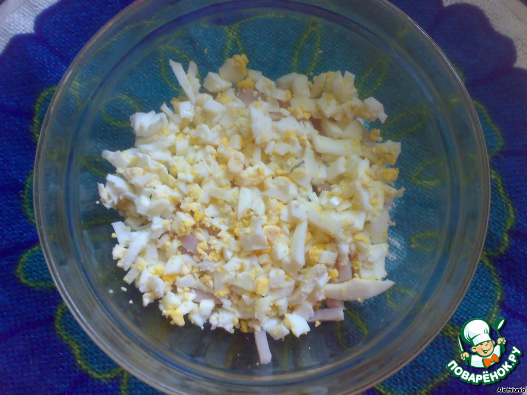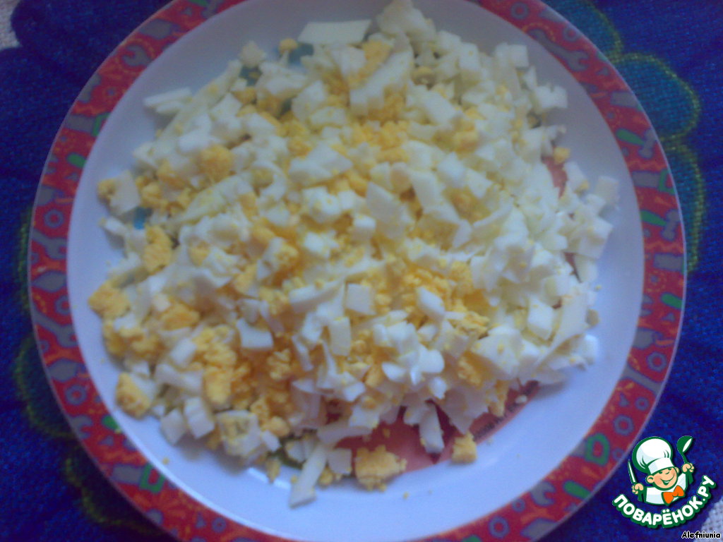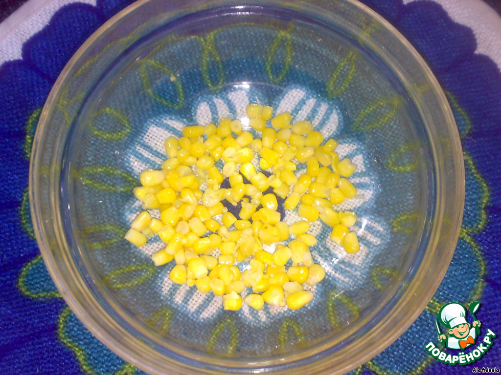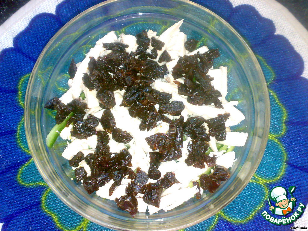 В стеклянный салатник выкладывать слоями кукурузку, ветчину, яйца, огурец, филе, чернослив, сыр.