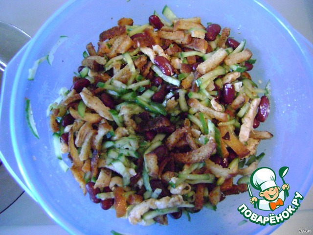 Грудку, огурцы, хлеб порезать соломкой. Курицу посыпать приправой для курицы(обычно она уже соленая) и пожарить на ростительном масле до готовности. Хлеб тоже пожарить с добавлением приправы для курицы. Готовые сухарики выложить на бумажную солфетку чтобы стекло лишнее масло. Все смешать. Добавить фасоль и чеснок. Еще раз перемешать. Заправить майонезом и можно кушать. Если вы этот салат готовите заранее, то сухарики добавте перед подачей на стол.