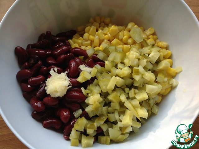 Открыть банки с фасолью и кукурузой, слить лишнюю жидкость и выложить в салатник.