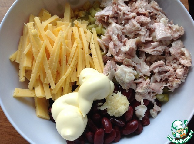 Сыр нарезать соломкой, куриное филе кубиками. Добавить майонез и перемешать.