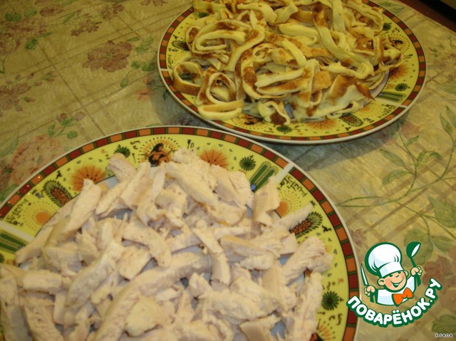 После того, как блинчики и отваренное филе остынут - нарезаем все соломкой.