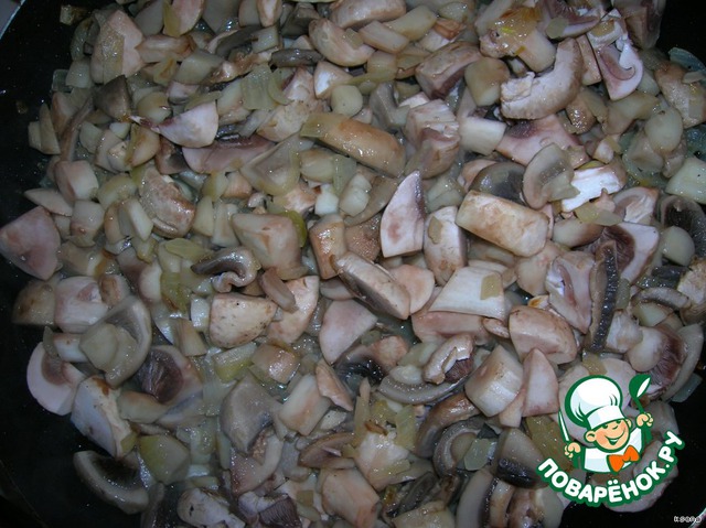 Далее мелко режем лучок, немного обжариваем и следом добавляем грибочки, предварительно порезанные, все это вместе тушим минут 15 - 20.