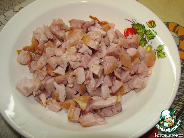 Мясо копченой курицы отделить от костей и нарезать кубиками.