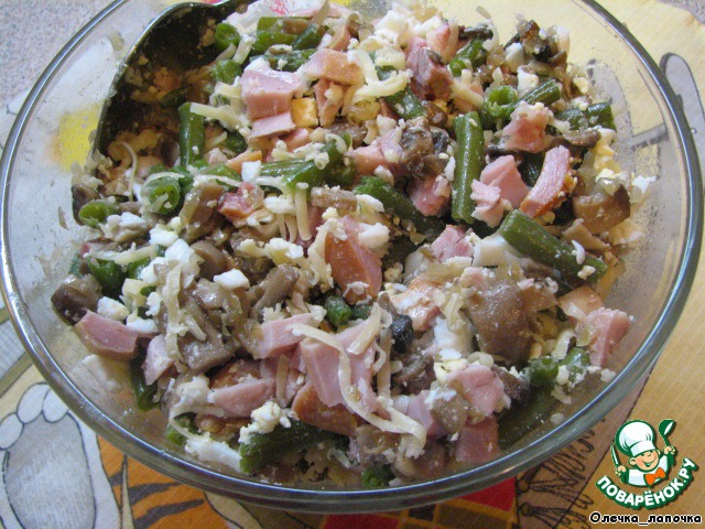 Курицу, фасоль, грибы выложить в салатник, добавить туда же натертый сыр, рубленные яйца, посолить и перемешать.