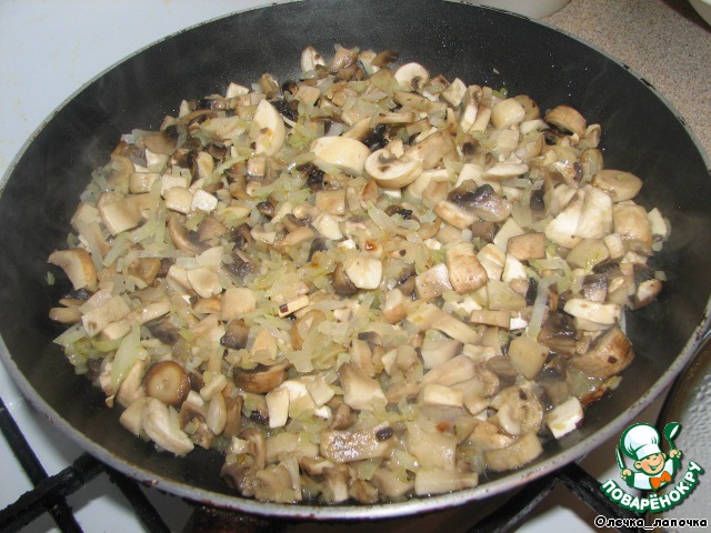 В сковороде с маслом немного обжарить лук, выложить туда грибы и перемешать. Жарить, периодически помешивая 10 минут. Остудить.