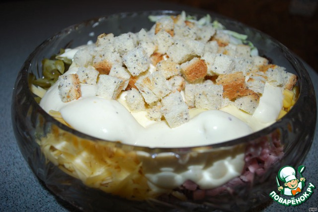 Поливаем наш салат. Перед подачей сверху присыпаем сухариками.