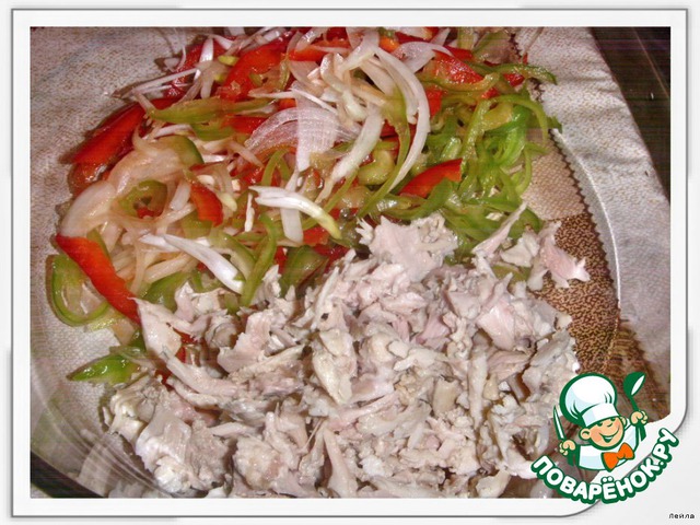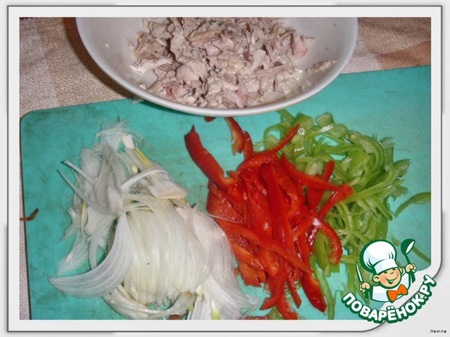Нашинковать лук и перцы соломкой, перетереть с солью.