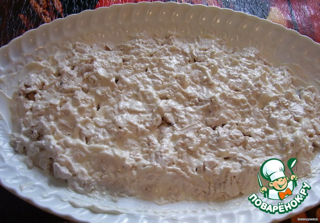 Укладываем на плоское блюдо и смазываем сверху довольно обильно майонезом. Почему обильно?больше майонез мы добавлять не будем.