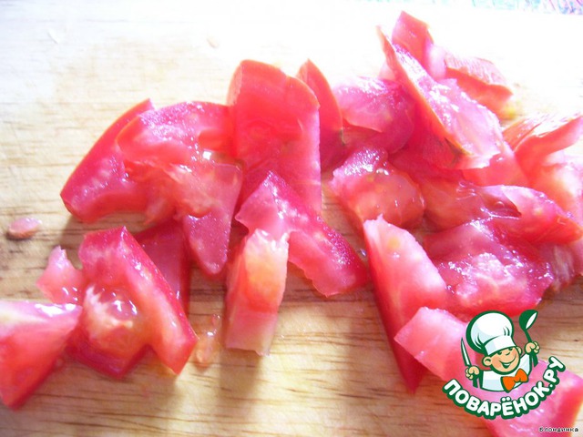 Помидоры тоже мелко нарезаем. Если они очень сочные, то удалите серединку с семенами.