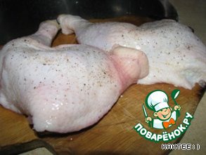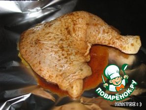 Заворачиваем каждую "ногу" отдельно в фольгу. Поливаем маринадом и в духовку до готовности.