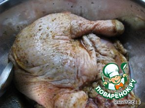 Обмазываем курицу в этом маринаде и ставим в холодильник. У меня стояла где-то час. можно оставить и на дольше,что бы лучше пропиталась.