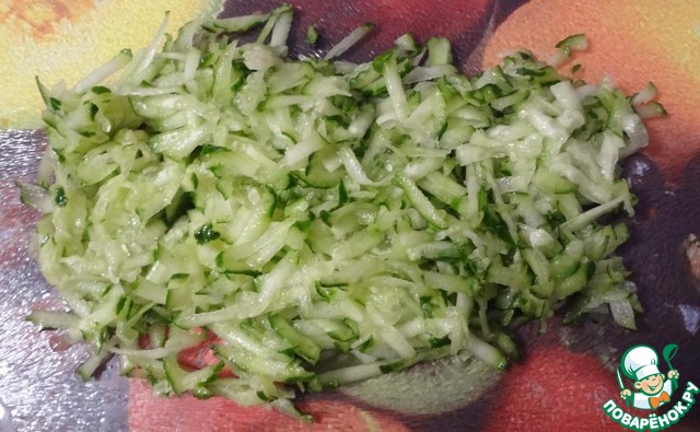 Свежий огурец трем на крупной терке (можно нарезать соломкой, кому как). Выкладываем в салатник.
