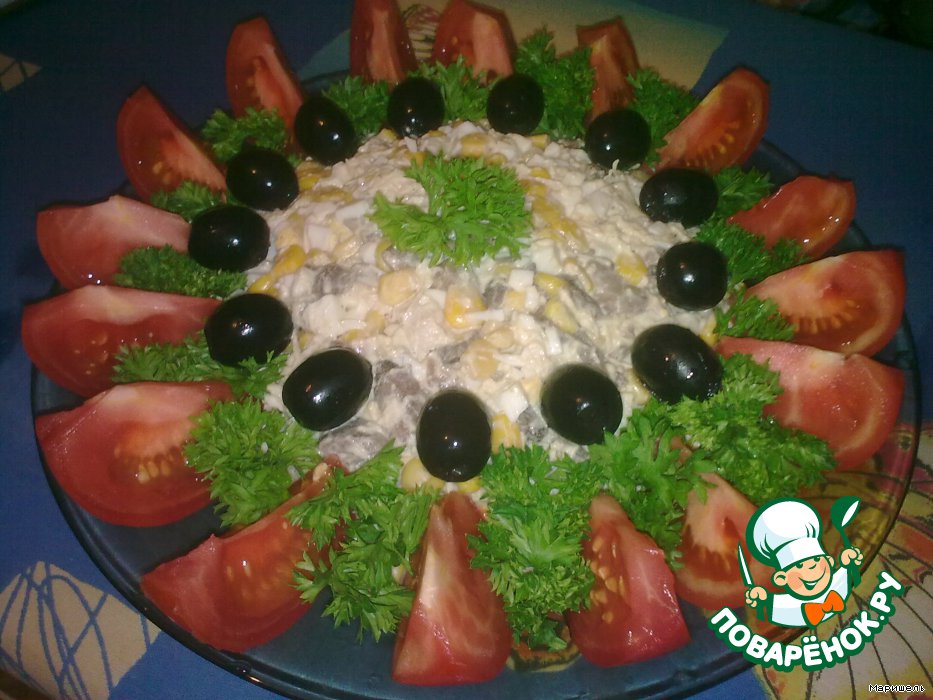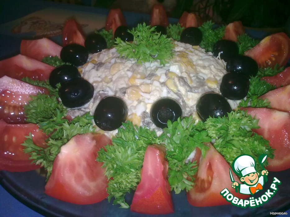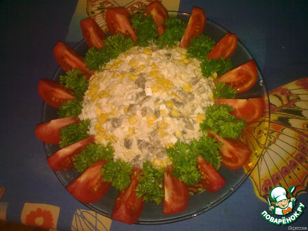 Обжарим шампиньоны до готовности. Мелко порежем вареную куриную грудку и яйца. Все перемешаем, добавим кукурузу, соль и майонез. Выложим на блюдо с большими полями.