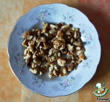 Чернослив заварить в кипятке на 15 минут. Вынуть, нарезать дольками и положить в салатницу.