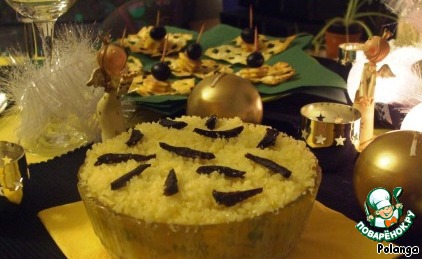 | Салат для тех, кто любит сочетание мяса с черносливом, достаточно сытный, но со свежей огуречной нотой. Специально для конкурса "Gorenje: новогодняя композиция" прикрыт «тигровой шкурой»! P. S. При приготовлении этого салата ни одного тигра не пострадало. |
