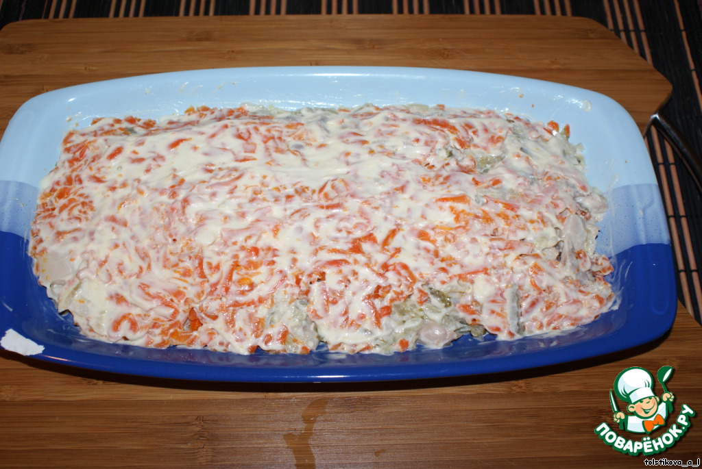 Bторым слоем выложить натертую вареную морковь, смазать сметаной.