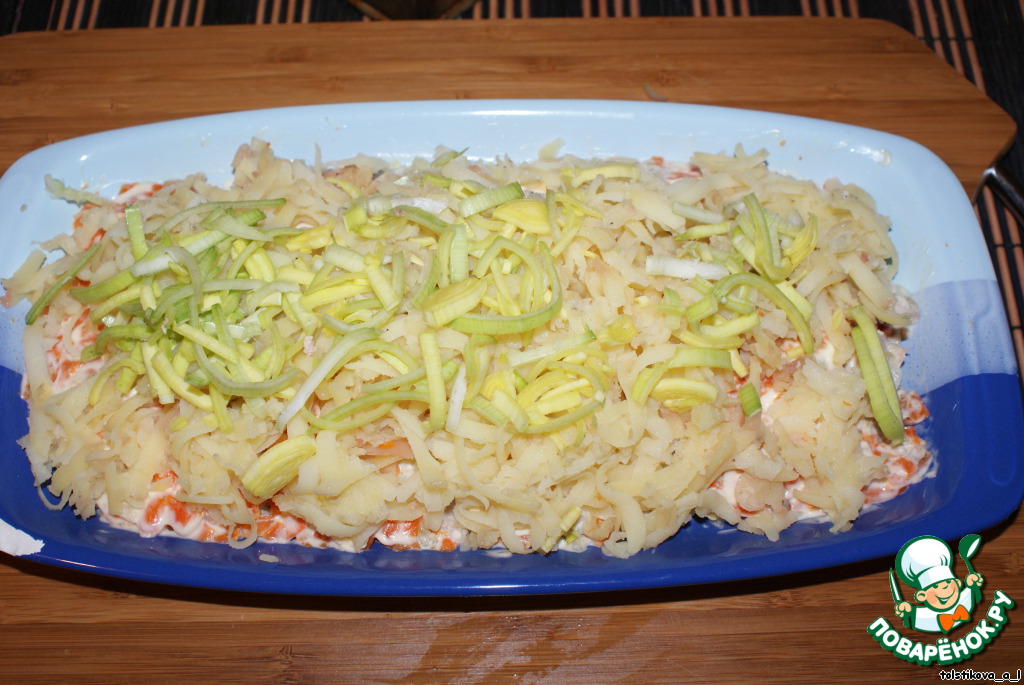 На морковь потереть вареный картофель, на картофель порезаный лук-порей, посолить, смазать сметаной.