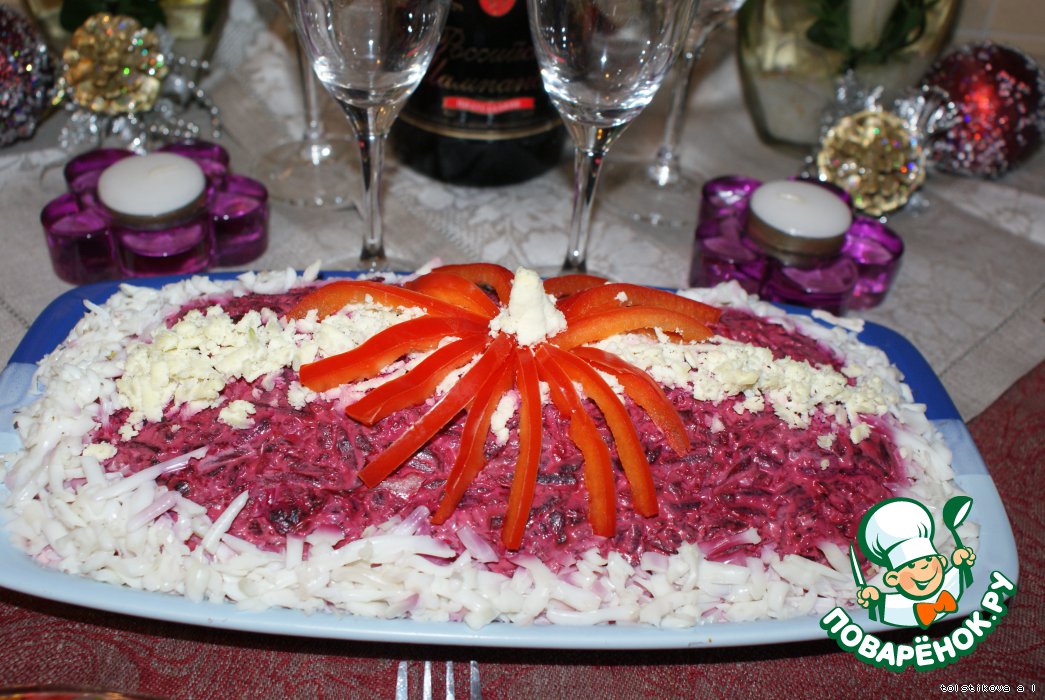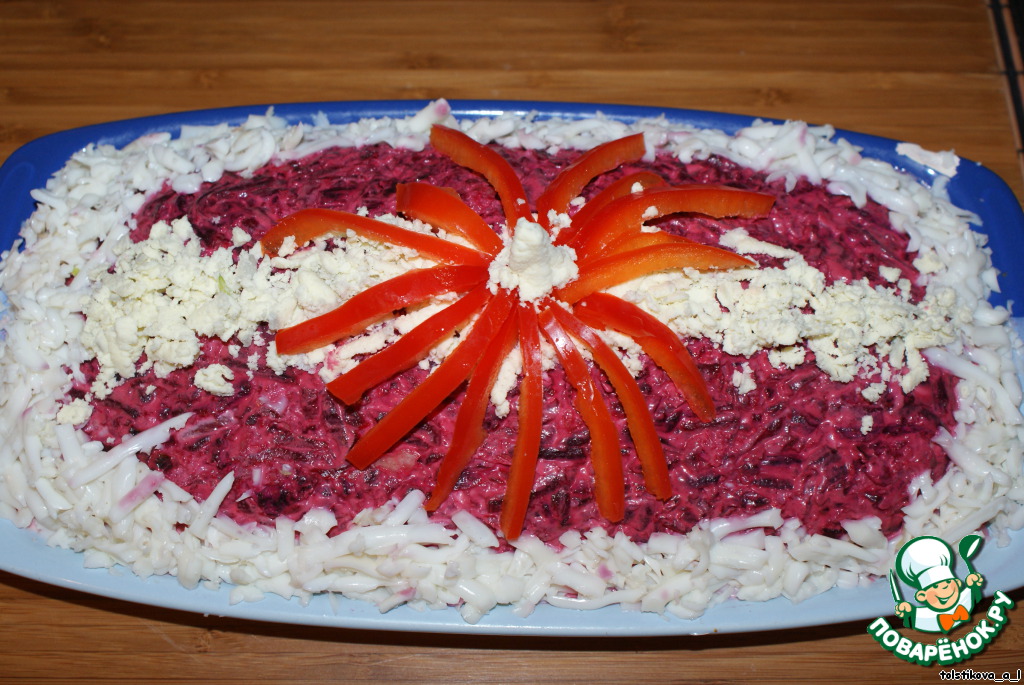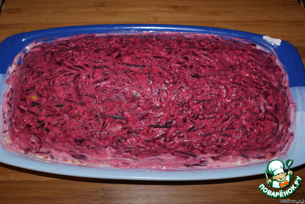 Для свекольного слоя, смешать свеклу с чесноком и сметаной, посолить.