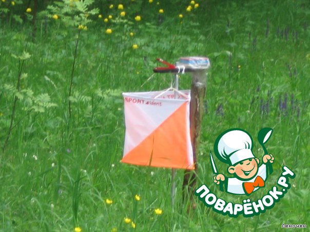 Мои детки занимаются таким видом спорта, как спортивное ориентирование. На день рождения моего сына, уж очень мне хотелось его удивить и порадовать, и вот я изобрела такой необычный салатик. Его я оформила в виде КП, кто не понимает, о чем идет речь, я прилагаю это фото. На нем Контрольный Пункт, где должен отметиться, следуя по дистанции, ориентировщик, в натуральном виде. :-)