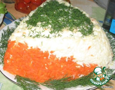 Украсить в виде КП: белый цвет - яичным белком, оранжевый - морковкой, оформить зеленью. Салат готов! Приятного аппетита!