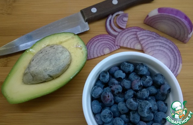 Красный лук нарежьте полукольцами. Авокадо нарезать на кусочки и перемешайте с лимонным соком. Голубику или чернику помыть обсушить. Сыр Фета нарезать на квадратики.